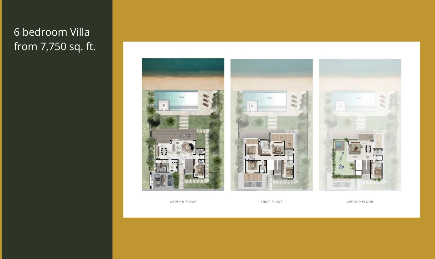 • 别墅:三卧室别墅面积约为 2,691 平方英尺,七卧室海滨豪宅面积可达 16,146 平方英尺。